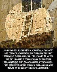The Church of the Holy Sepulcher in Jerusalem is where Jesus was resurrected. It is a site claimed by 6 branches of Christianity. On the ledge above the entrance to the Holy Sepulcher there is a wooden ladder that has been there for more than 250 years. Way back in the 1700’s someone put out that ladder to access the roof. Any unilateral action by any one branch of those who claim ownership of the Holy Sepulcher insinuates a higher status of ownership relative to the other branches and therefore only a unanimous decision can make any changes…..and so it still stands there to this day.